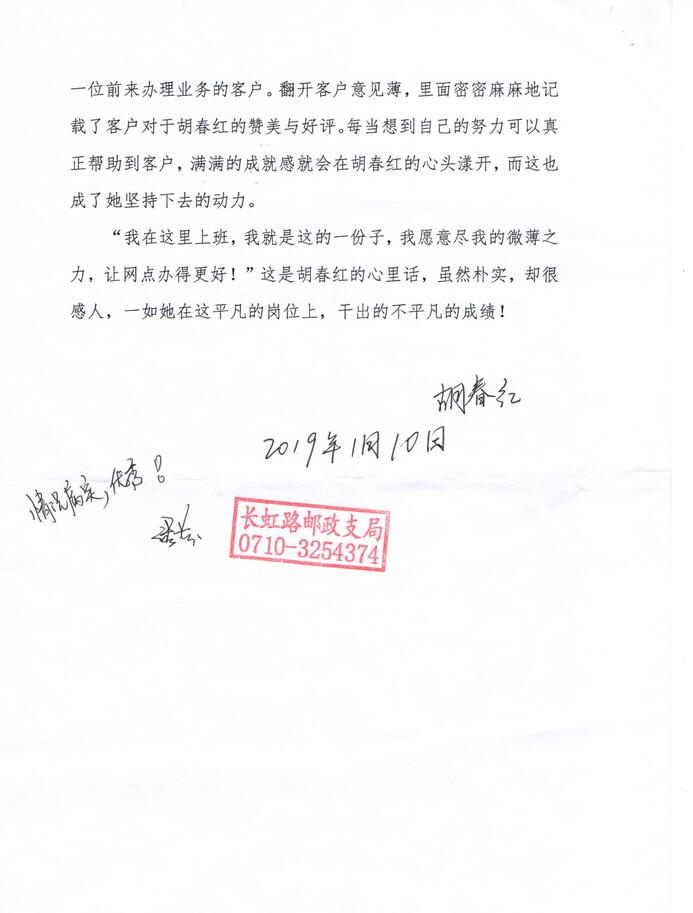 還有一次,一對老夫妻來網(wǎng)點辦理業(yè)務(wù),老大大心臟病突發(fā),動彈不得,胡春紅二話沒說撥打了120急救電話,又是遞上熱水又是幫忙攙扶她到座椅上休息,然后,她想也沒想就跑到最近的藥店,自費買了一盒速效救心丸,在稍事休息后老太大有所好轉(zhuǎn)事后,老兩口多次來到網(wǎng)點要把藥費還給胡春紅,都被她拒絕了,最終,老大大親自寫了整整兩頁紙的感謝信,交到了胡春紅手中。將客戶遺失在網(wǎng)點的物品及時收起來,妥善保管,待客戶來時物歸原主;主動給客戶講解宣傳存款政策,幫助網(wǎng)點提升業(yè)績……這樣的事跡還有很多,胡春紅用她的熱情、真誠感染著每一位前來辦理業(yè)務(wù)的客戶。翻開客戶意見薄,里面密密麻麻地記載了客戶對于胡春紅的贊美與好評,每當想到自已的努力可以真正幫助到客戶,滿滿的成就感就會在胡春紅的心頭漾開,而這也成了她堅持下去的動力。“我在這里上班,我就是這的一份子,我愿意盡我的微薄之力,讓網(wǎng)點辦得更好!”這是胡春紅的心里話,雖然樸實,卻很感人,一如她在這平凡的崗位上,干出的不平凡的成績!
